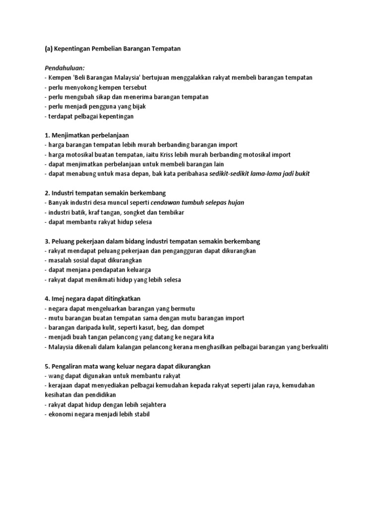 Banyak kilang yang didirikan untuk menghasilkan barangan tempatan. Huraikan pendapat anda tentang kebaikan membeli barangan buatan tempatan panjangnya huraian hendaklah antara 200 hingga 250 patah perkataan. Industri pembuatan produk negara kita berkembang maju apabila kita menggalakkan rakyat jelata membeli barangan buatan malaysia. Sejajar dengan landaan gelombang globalisasi dengan pelbagai corak roda pembangunan telah bergerak pantas bagai lipas kudung di nusa tercinta ini sehingga mengalami anjakan paradigm ke arah menggapai hasrat sebagai.
