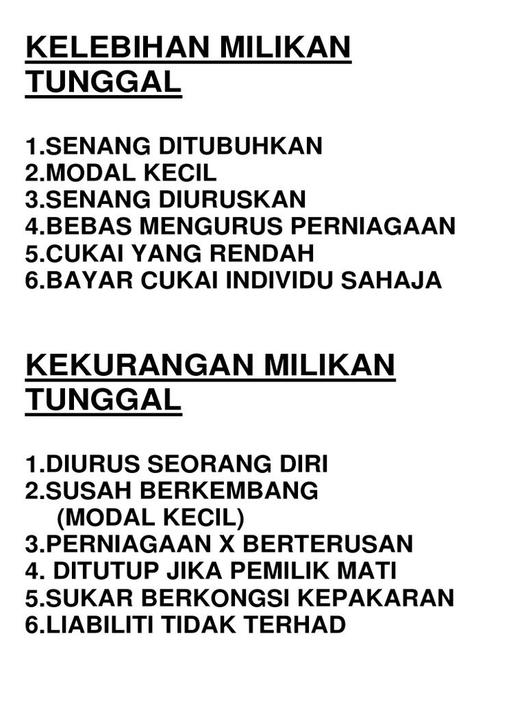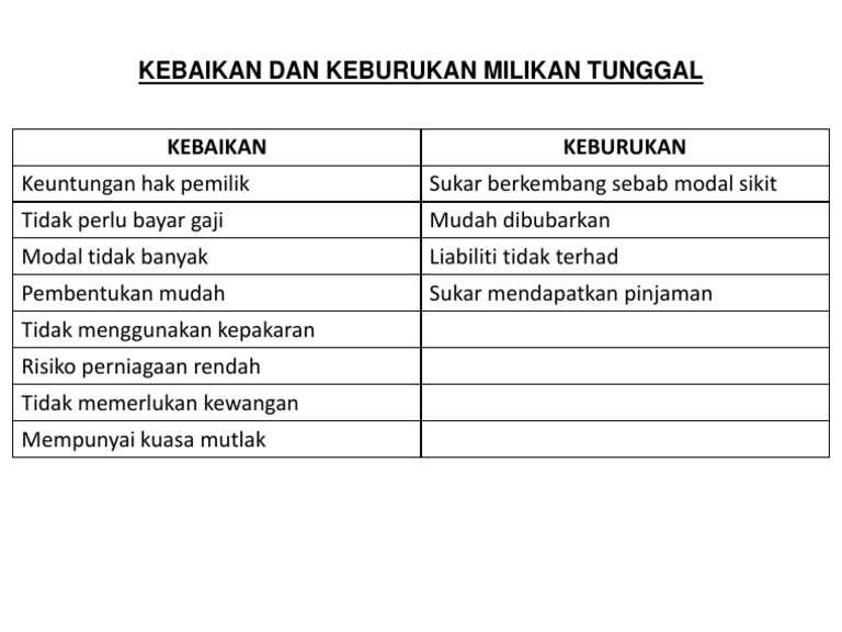Kelebihan perniagaan milikan tunggal. Liabiliti keuntungan yang diperolehi pemilik tunggal adalah tertakluk kepada kadar cukai pendapatan seseorang 1. Ciri ciri a milikan milikan tunggal dimiliki oleh seorang individu secara bersendirian. Jumlah modal yang dimiliki modal kecil pilih milikan tunggal 2. Oleh kerana ia adalah milik individu maka pemilik perniagaan mempunyai kuasa atau hak mutlak untuk mengawal perjalanan dan operasi perniagaannya sama ada dari segi keuntungan hutang dan juga bebanan perniagaan.